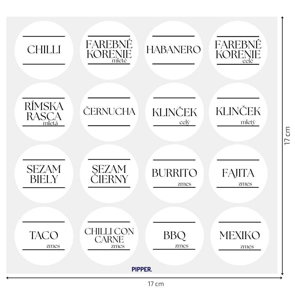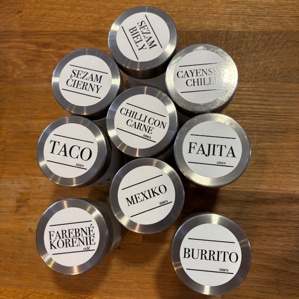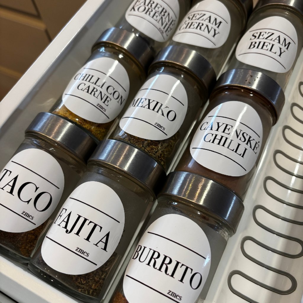 Každé korenie má svoju nálepku - všetky v rovnakom, čistom dizajne.