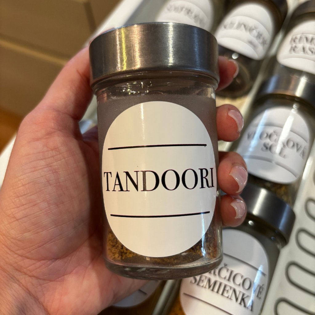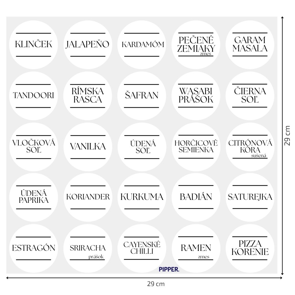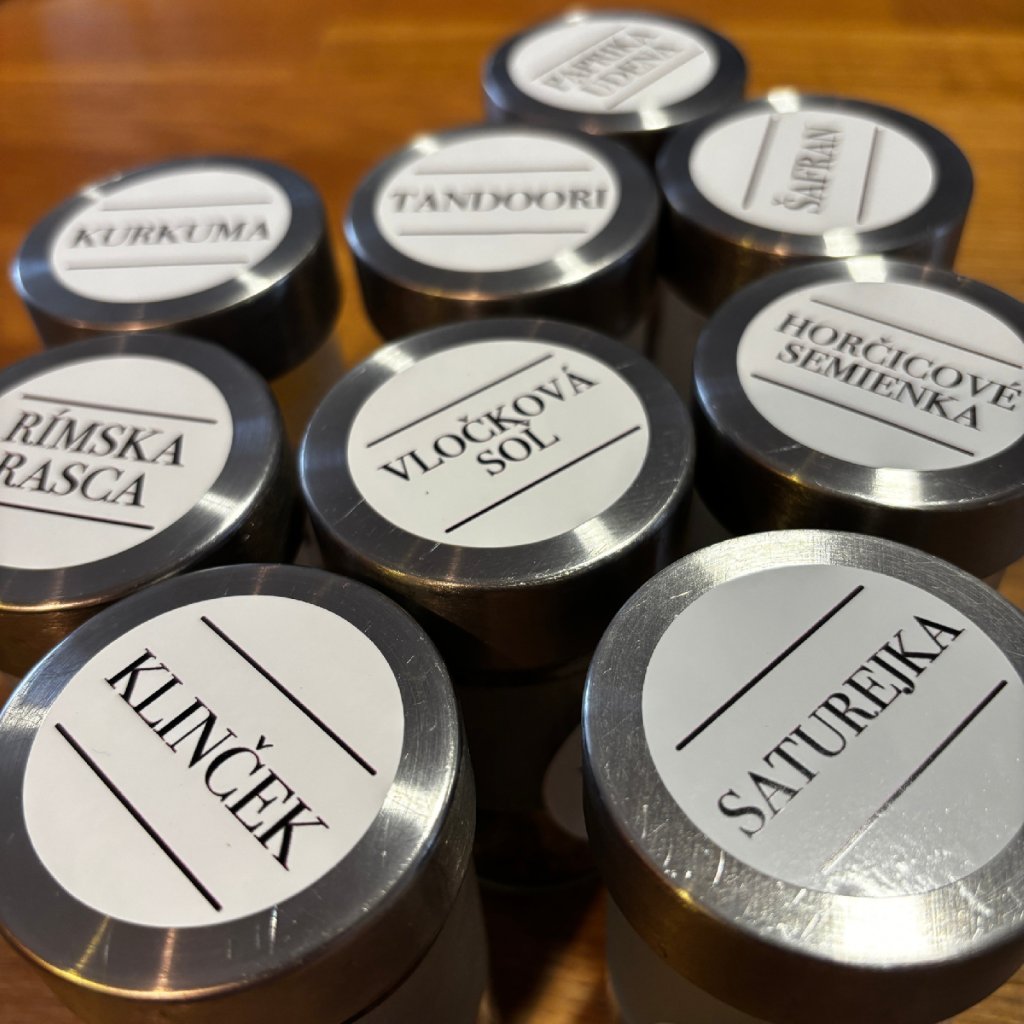 Každé korenie má svoju nálepku - všetky v rovnakom, čistom dizajne.