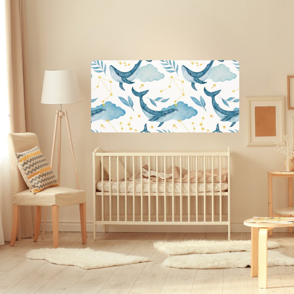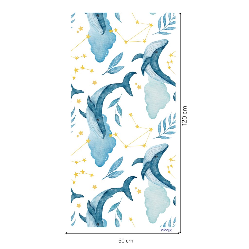 - Dizajn: Krásna samolepiaca tapeta s motívom veľrýb na oblohe v akvarelovom štýle, ideálna do detskej izby.
