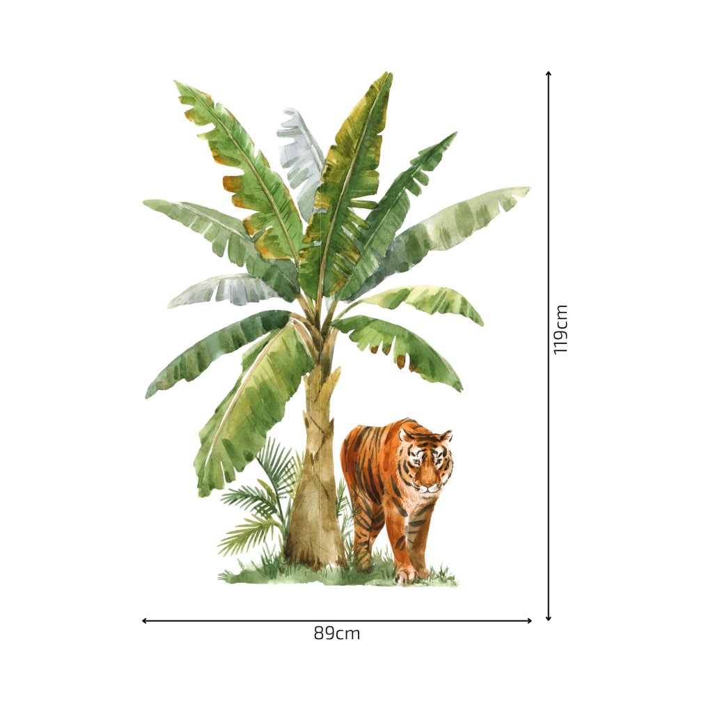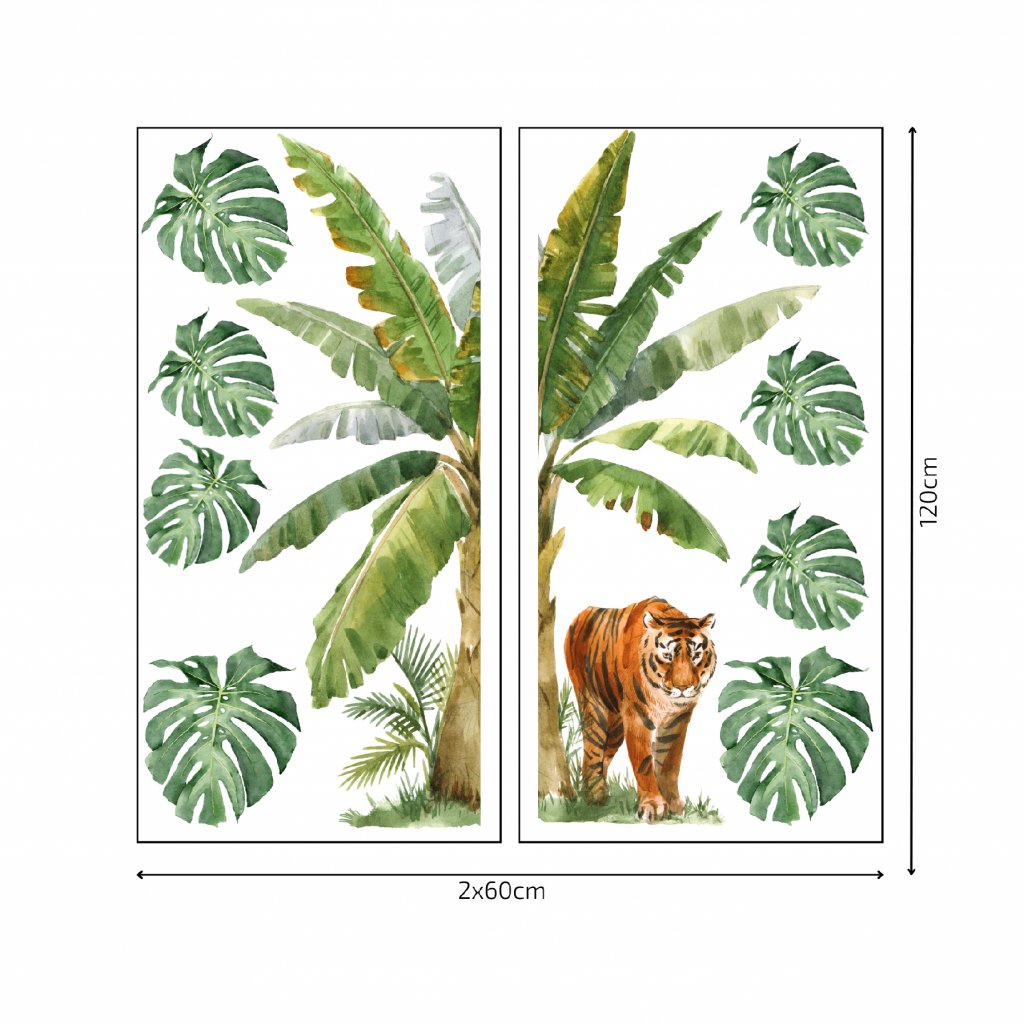 Veľkosť: Kvôli svojej veľkosti je nálepka rozdelená na 2 časti pre jednoduchšiu aplikáciu. Veľká palma a tiger vytvárajú ústredný bod, zatiaľ čo listy monstery môžu byť rozmiestnené podľa tvojho vkusu, čo pridáva flexibilitu v dizajne.