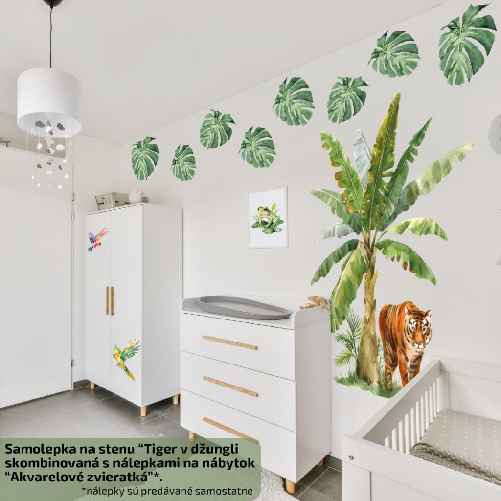 Táto nálepka prinesie do tvojho domova atmosféru exotickej prírody. Nálepka je súčasťou našej tematickej kolekcie džungle a je vytlačená na transparentný matný vinyl, čo zaručuje jemný a elegantný vzhľad. Nálepka je vhodná do ktorejkoľvek miestnosti a kvôli svojej veľkosti je rozdelená na 2 veľké časti pre jednoduchšiu aplikáciu. Nálepka je vytvorená v štýle akvarel, čo jej dodáva umelecký a jemný vzhľad.