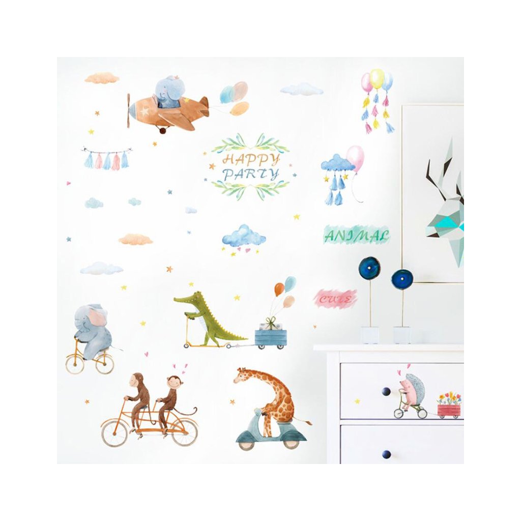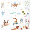 Veselá samolepka zvieratiek na rôznych dopravných prostriedkoch. Samolepka je kreslená v štýle akvarel.