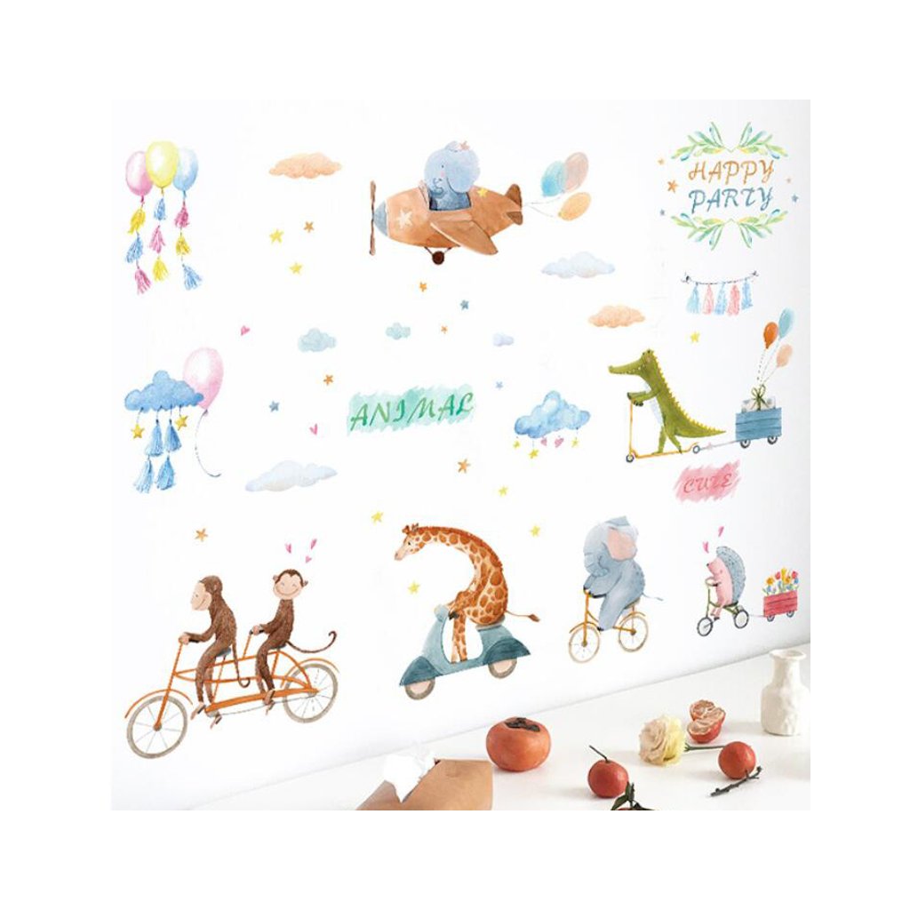 Veselá samolepka zvieratiek na rôznych dopravných prostriedkoch. Samolepka je kreslená v štýle akvarel.