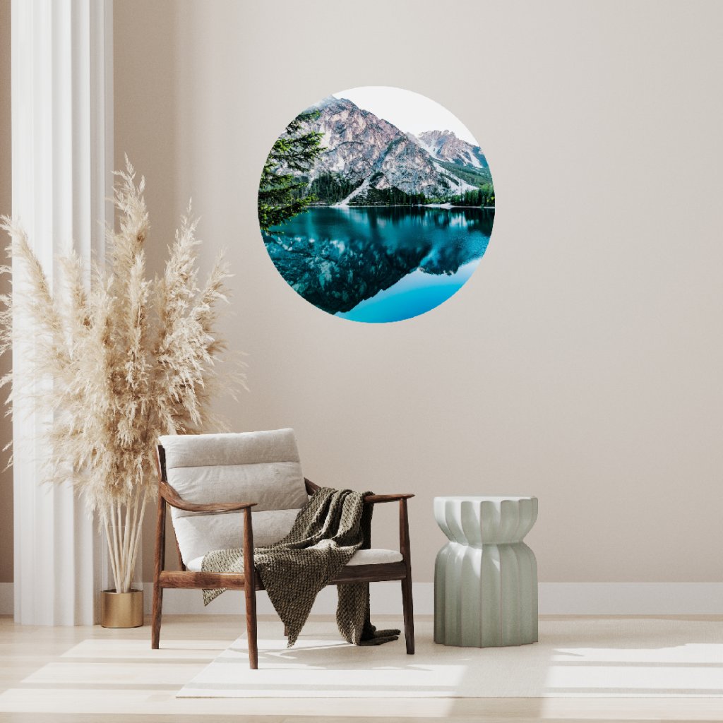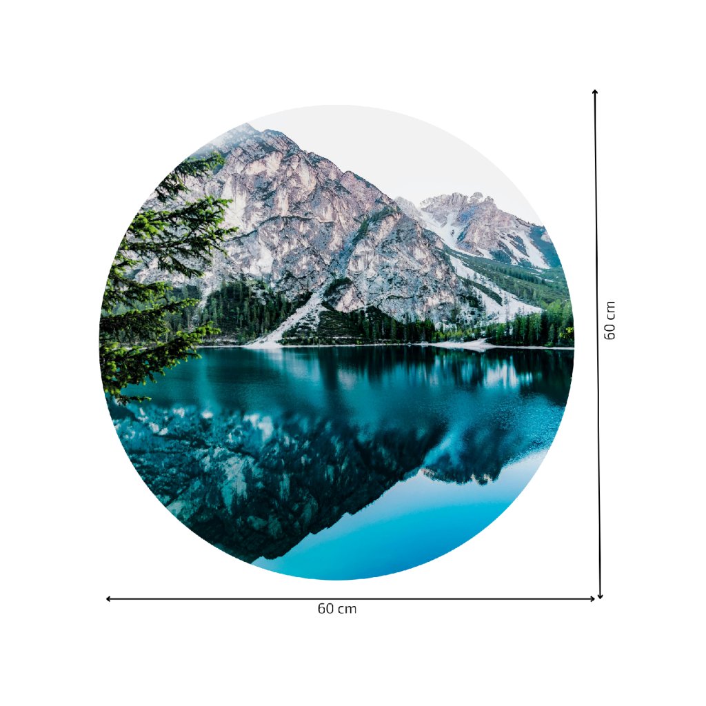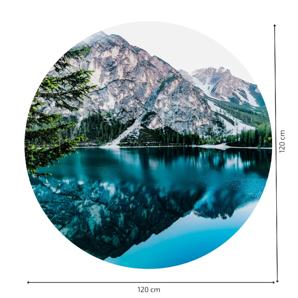 - Dizajn: Nadčasová kruhová nálepka s motívom horského odrazu prináša do každého priestoru nádych prírody.