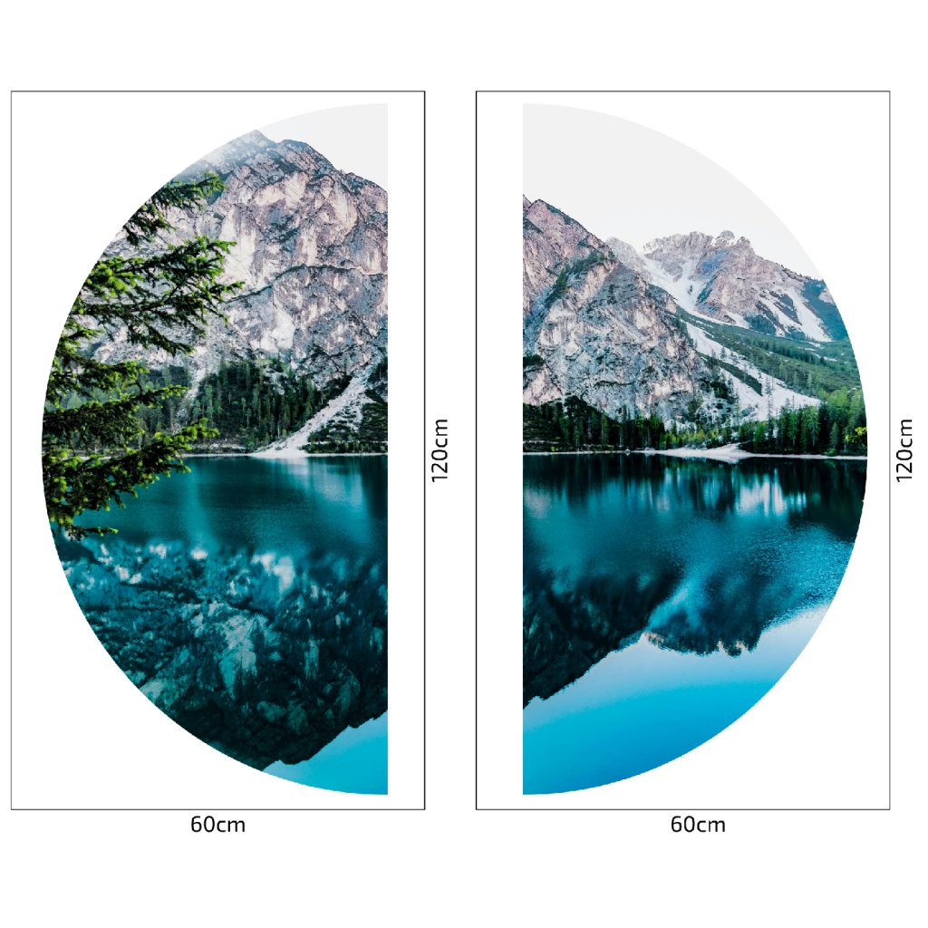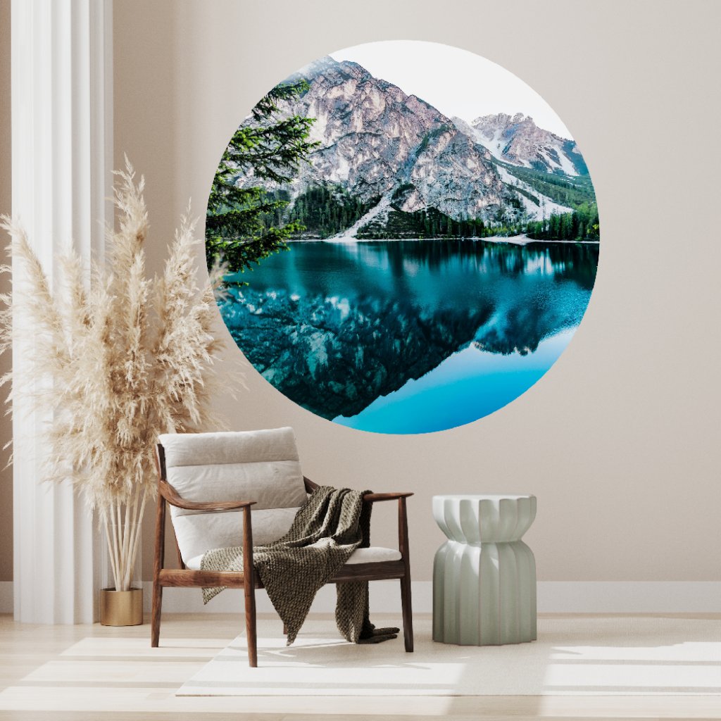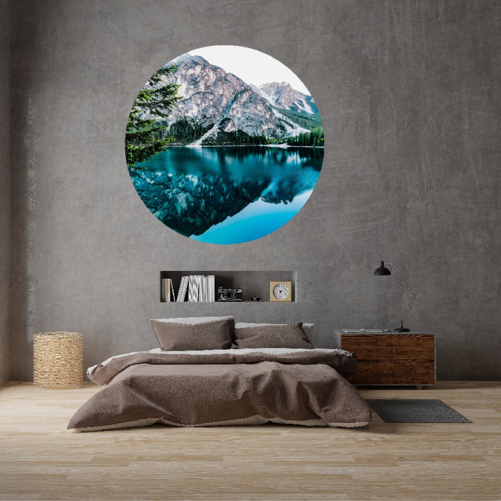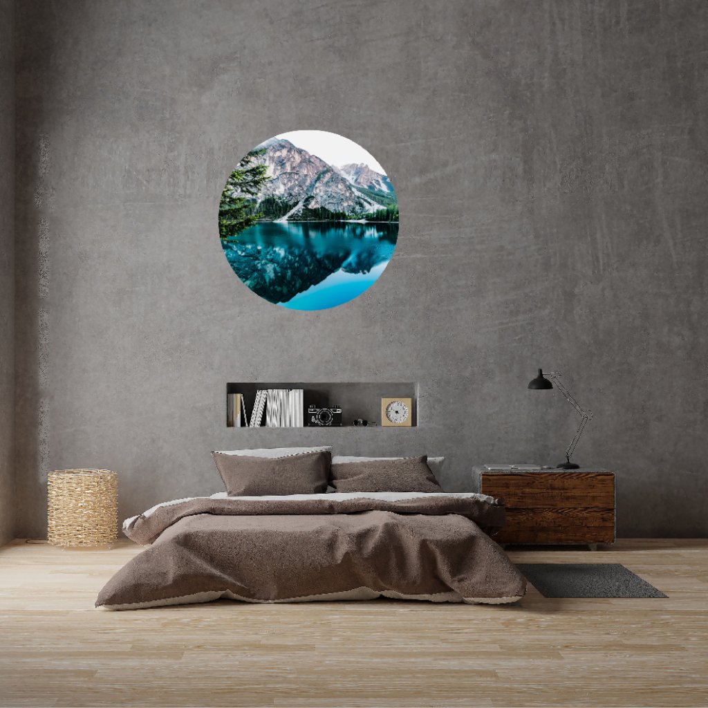 - Dizajn: Nadčasová kruhová nálepka s motívom horského odrazu prináša do každého priestoru nádych prírody.