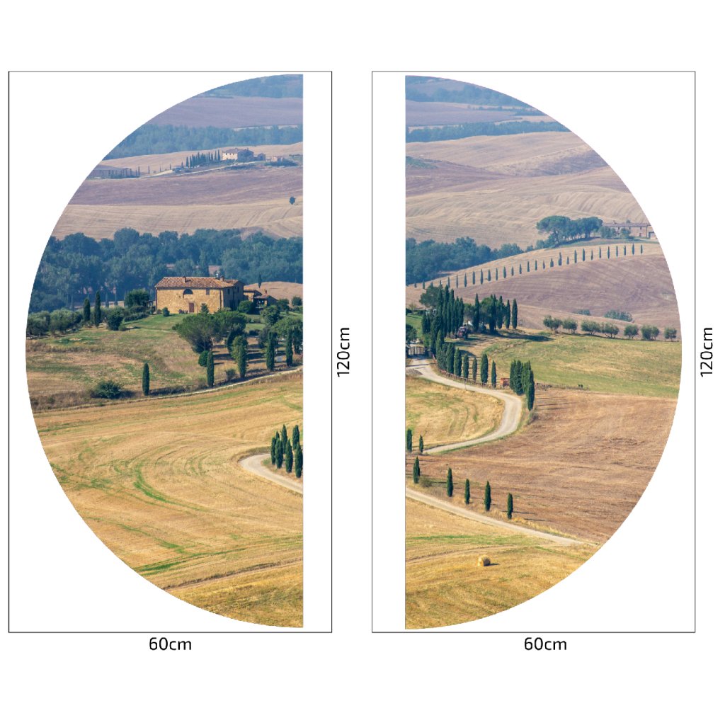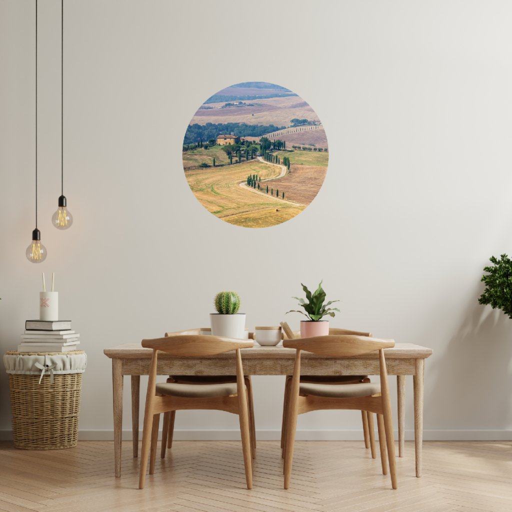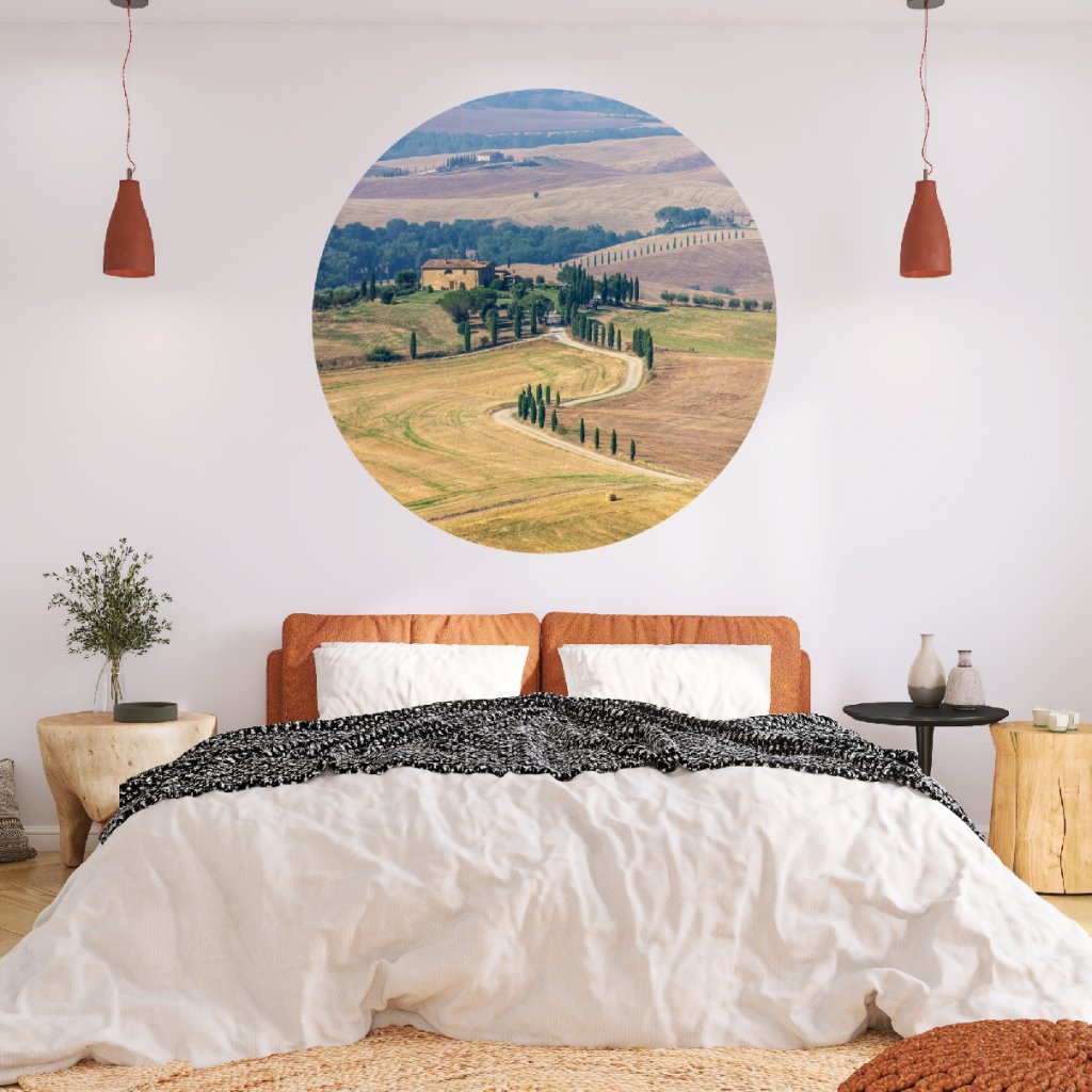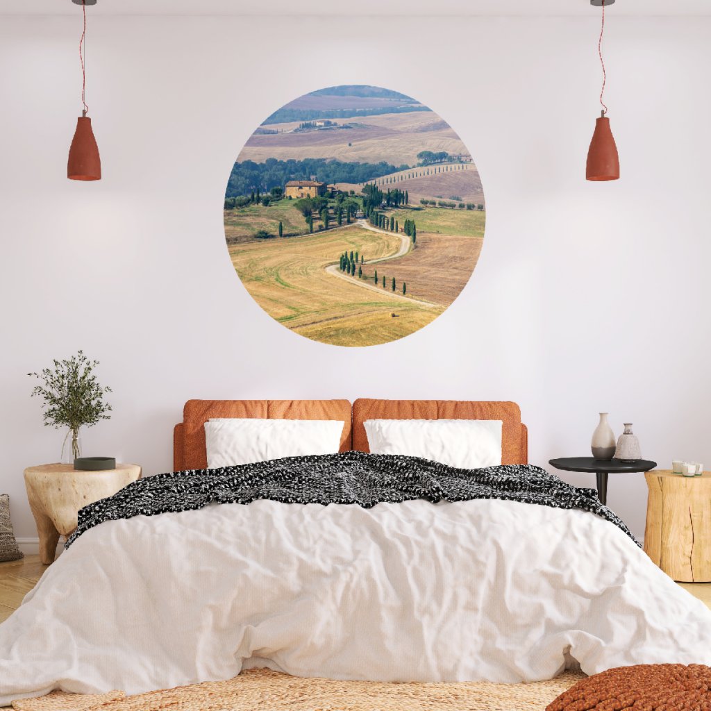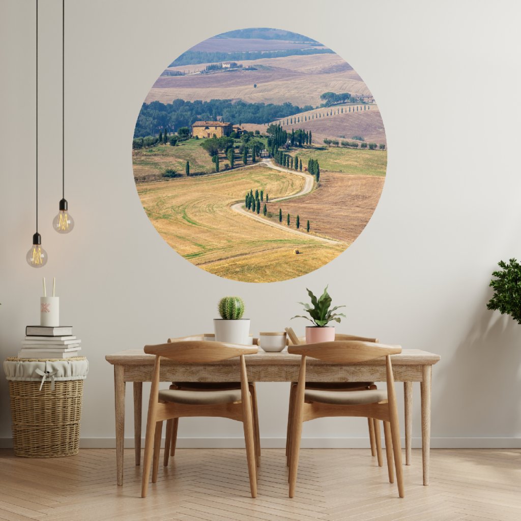 - Dizajn: Elegantná kruhová nálepka s romantickým výhľadom na toskánsku krajinu prinesie do tvojho priestoru teplo, pokoj a kúsok talianskeho vidieka.