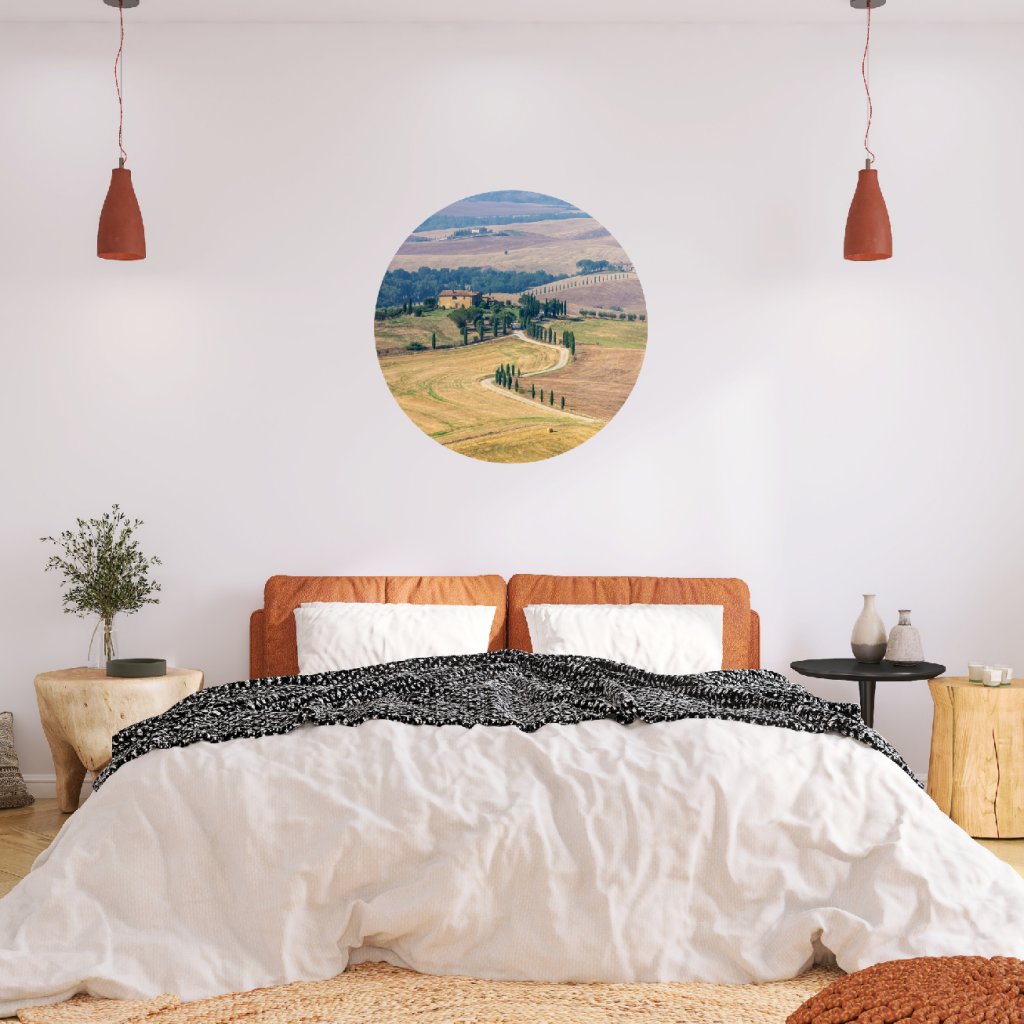 Textilná kruhová nálepka na stenu – "Toskánsko" – je ako pohľadnica z vidieckeho raja, ktorá ti každý deň pripomenie krásu jednoduchosti a pokoj talianskej krajiny. 🌾🇮🇹 Zlatisté polia, jemne zvlnené kopce a cestička lemovaná cyprusmi vytvárajú harmonickú scenériu, ktorá pôsobí upokojujúco a nadčasovo. Táto nálepka je ideálnym doplnkom do interiéru, ktorý potrebuje dotyk prírody, slnka a štipku stredomorskej atmosféry.