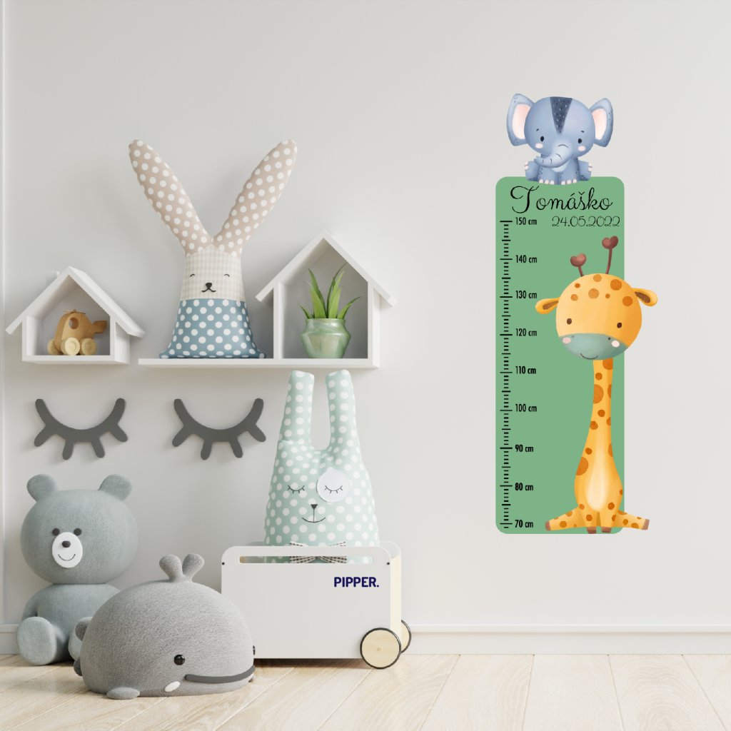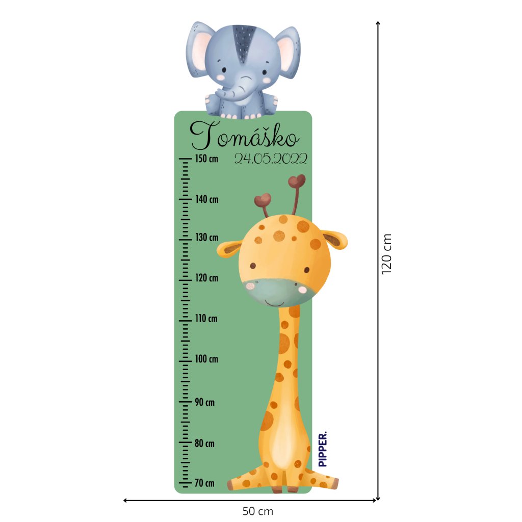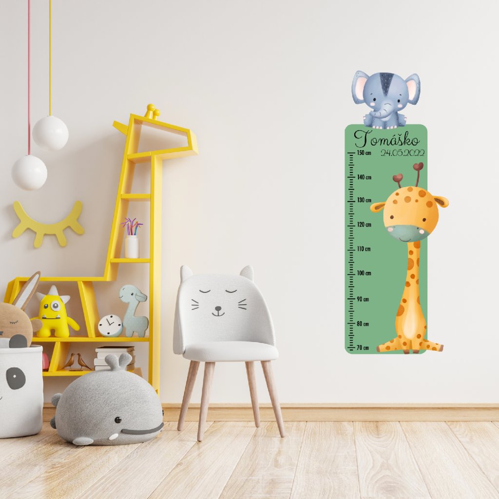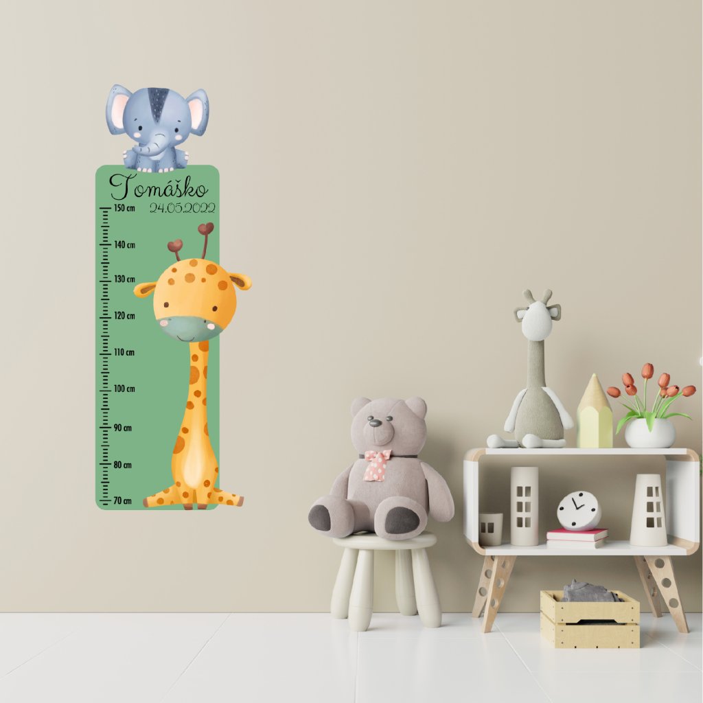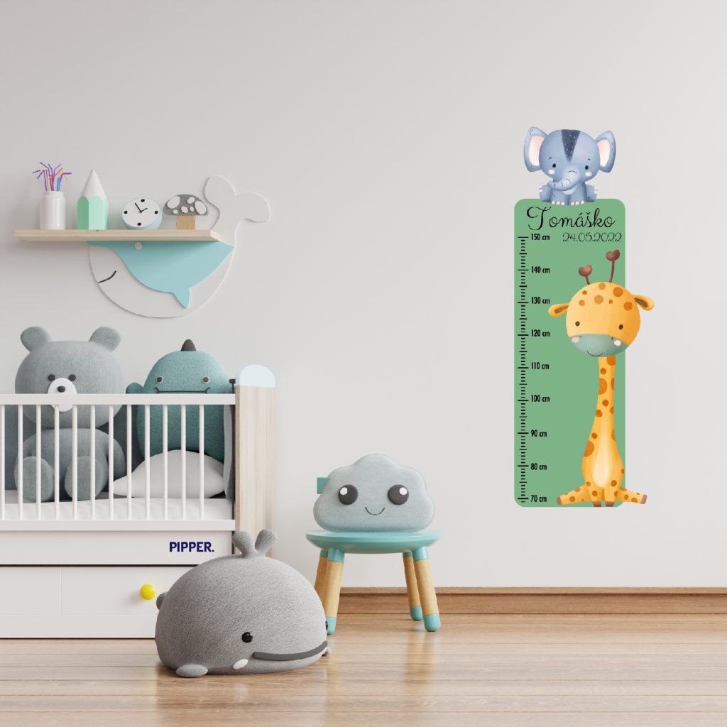 Detský meter „Safari“ je veselou kombináciou roztomilej žirafy a sloníka, ktorá rozžiari každú izbičku. Personalizovaný menom a dátumom narodenia sa stane krásnou spomienkou na detské roky plné objavov. Meria výšku od 70 do 150 cm a vďaka mäkkému textilnému materiálu je nielen štýlový, ale aj bezpečný a príjemný na dotyk.