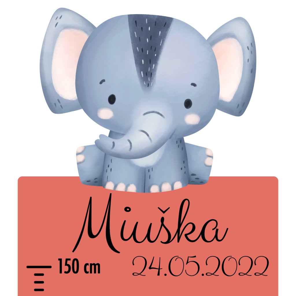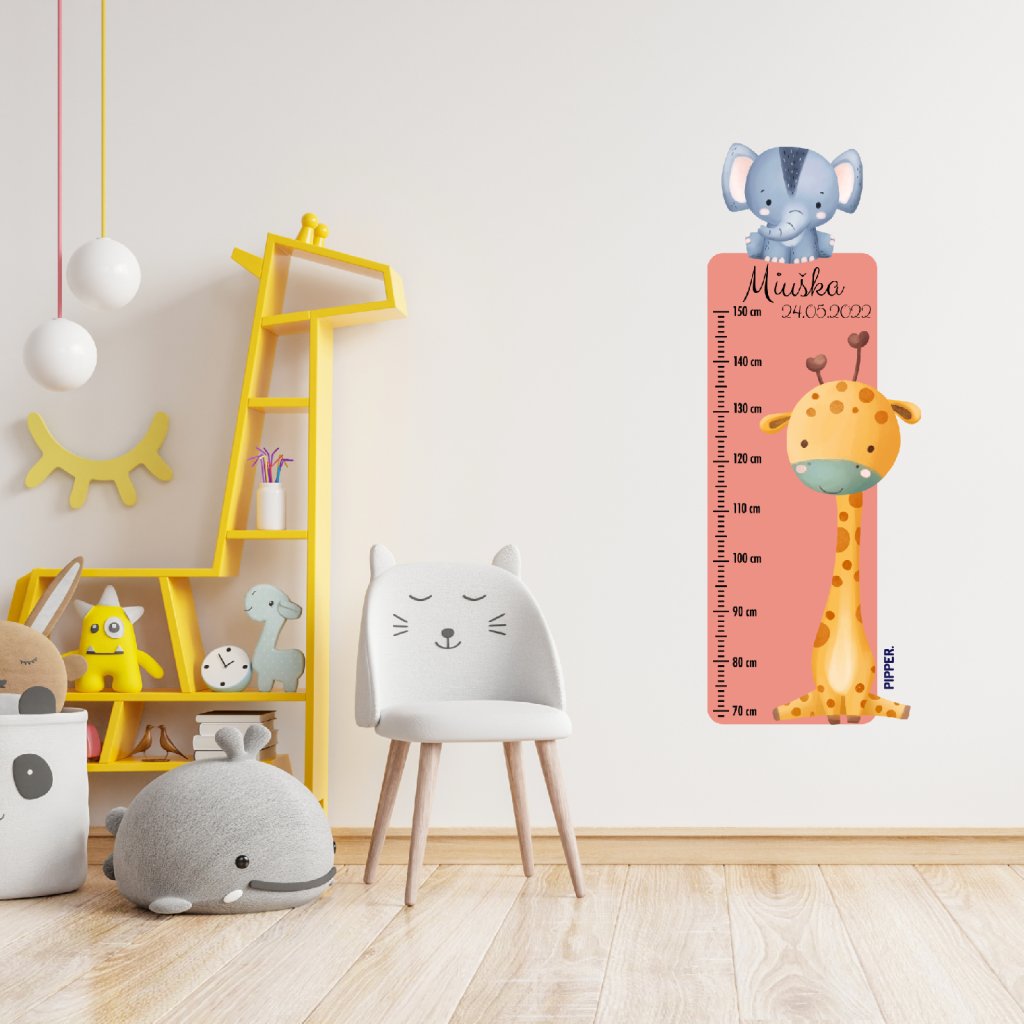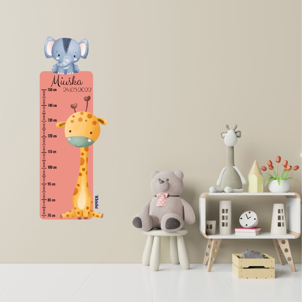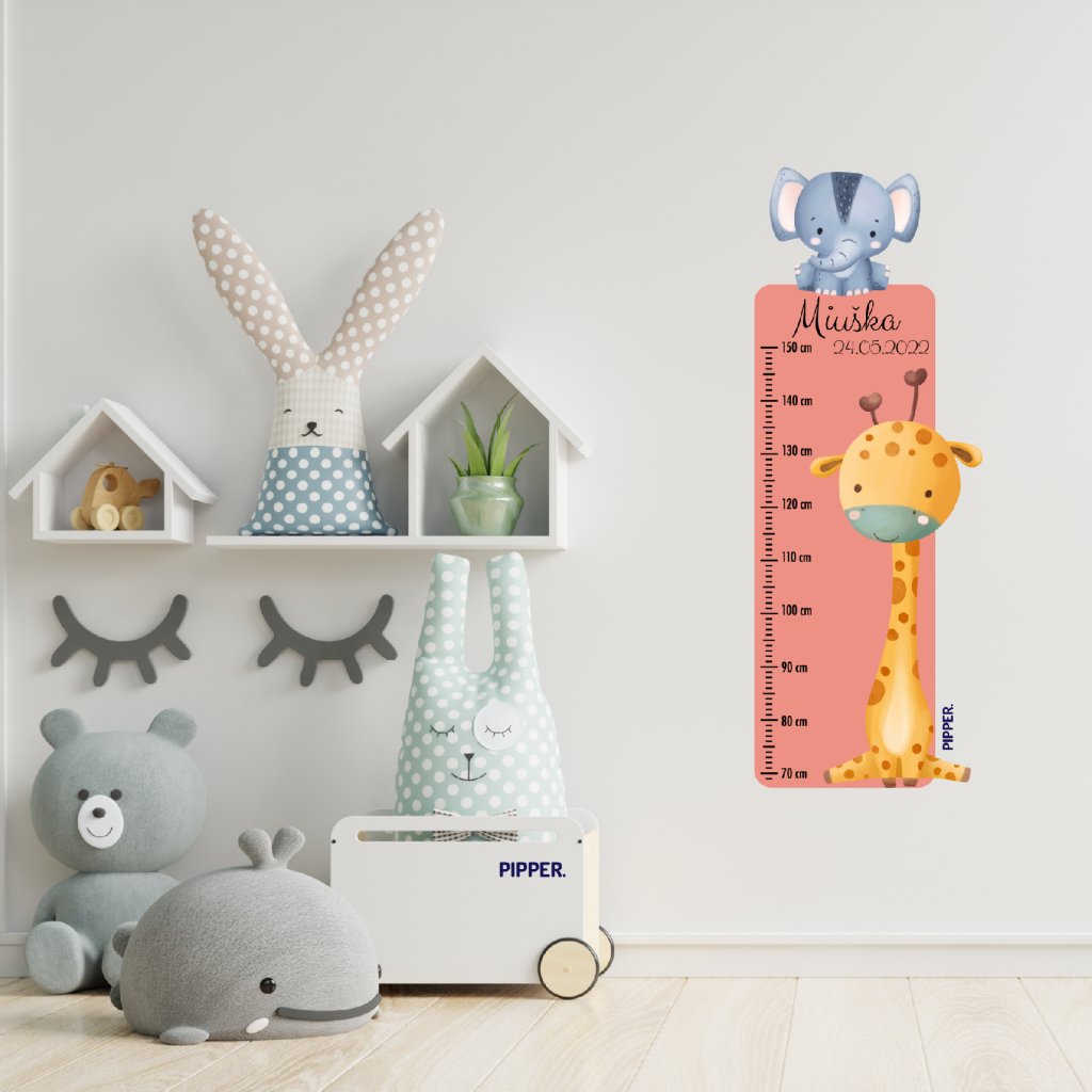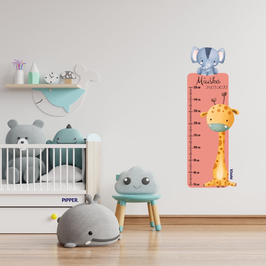 Detský meter „Safari“ je veselou kombináciou roztomilej žirafy a sloníka, ktorá rozžiari každú izbičku. Personalizovaný menom a dátumom narodenia sa stane krásnou spomienkou na detské roky plné objavov. Meria výšku od 70 do 150 cm a vďaka mäkkému textilnému materiálu je nielen štýlový, ale aj bezpečný a príjemný na dotyk.