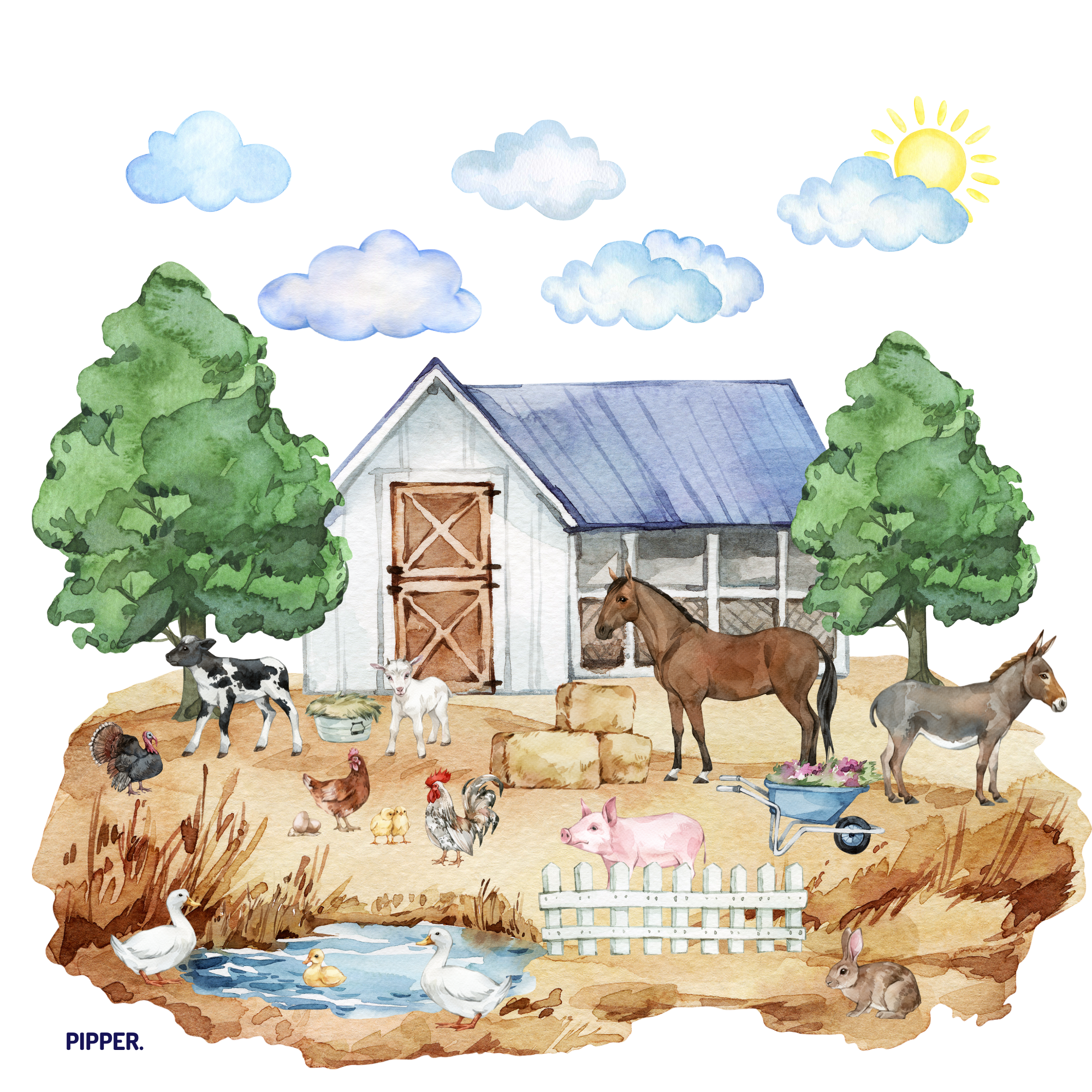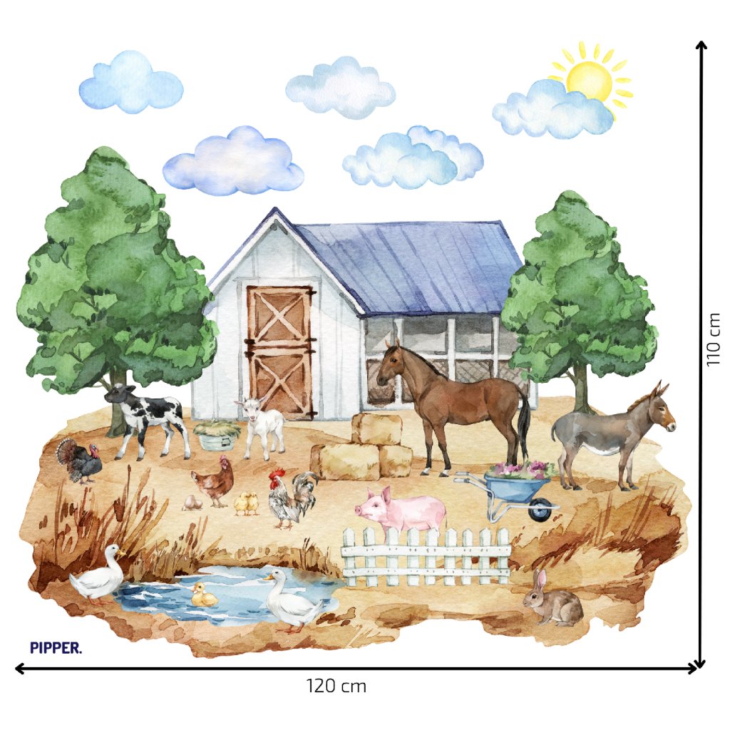 Tento veľký farmársky motív plný detailov a jemných farieb okamžite vytvorí v izbe hrejivú a hravú atmosféru. Deti si zamilujú sledovať jednotlivé zvieratká a vytvárať si vlastné príbehy – každý deň iný.
