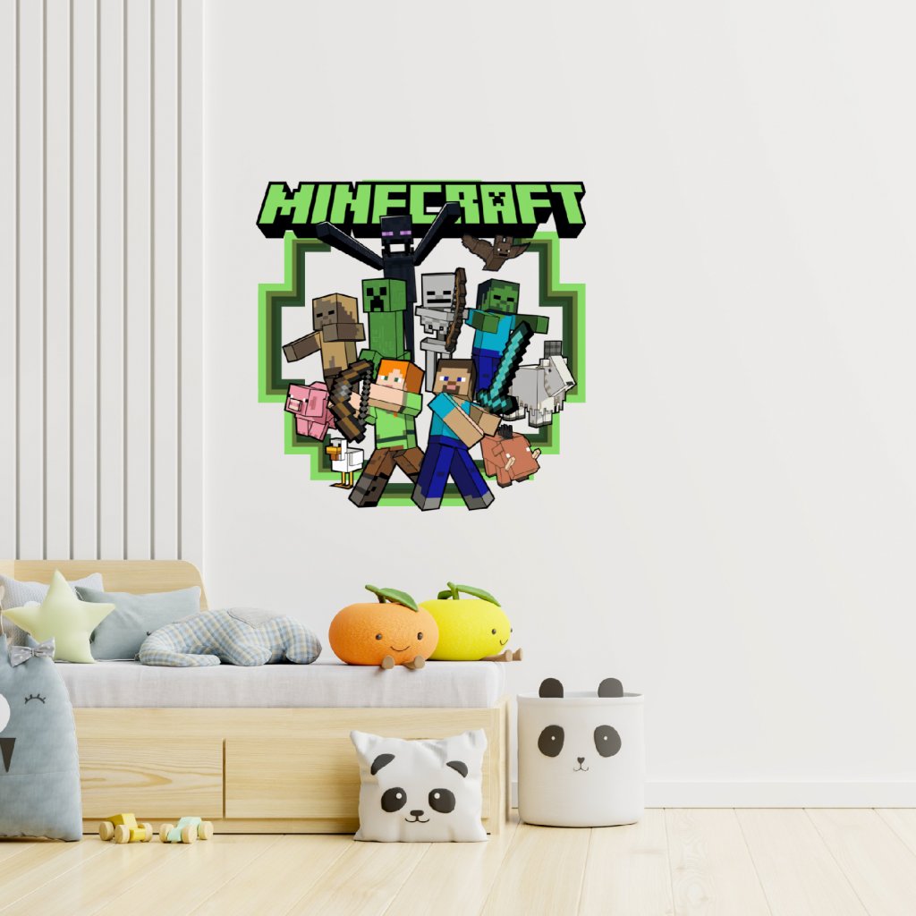 - Dizajn: Štýlová nálepka s postavičkami z hry Minecraft – Steve, Alex, creeper, zombie, skeleton, prasiatko, sliepka a ďalšie. Kockovaný 3D dizajn oživí každú detskú izbu a podporí kreativitu. ⛏🧱
